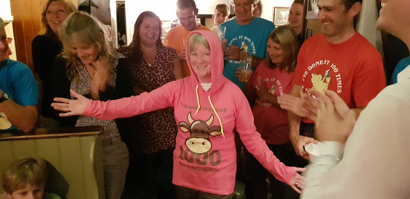 It was Cow Pats 1000th run and she was given a special 1000 hoody with a cow head on it. There have been 1156 South Hams Hashes, so her attendance since the start has been 86.5051903%.